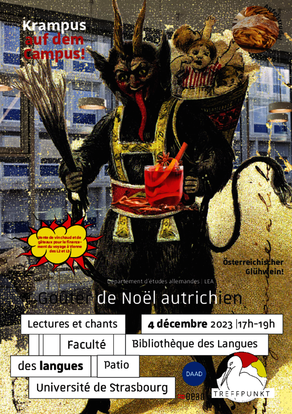 Venez nombreux et ravis au gôuter de Noël autrichien organisé par l'Amicale Treffpunkt. Pour financer leur voyage d'études à Vienne, les étudiant.e.s des départements d'allemand et LEA vendront de l'Apfelstrudel et du vraivin chaud autrichien. Il y aura également une lecture multilingue de contes et…